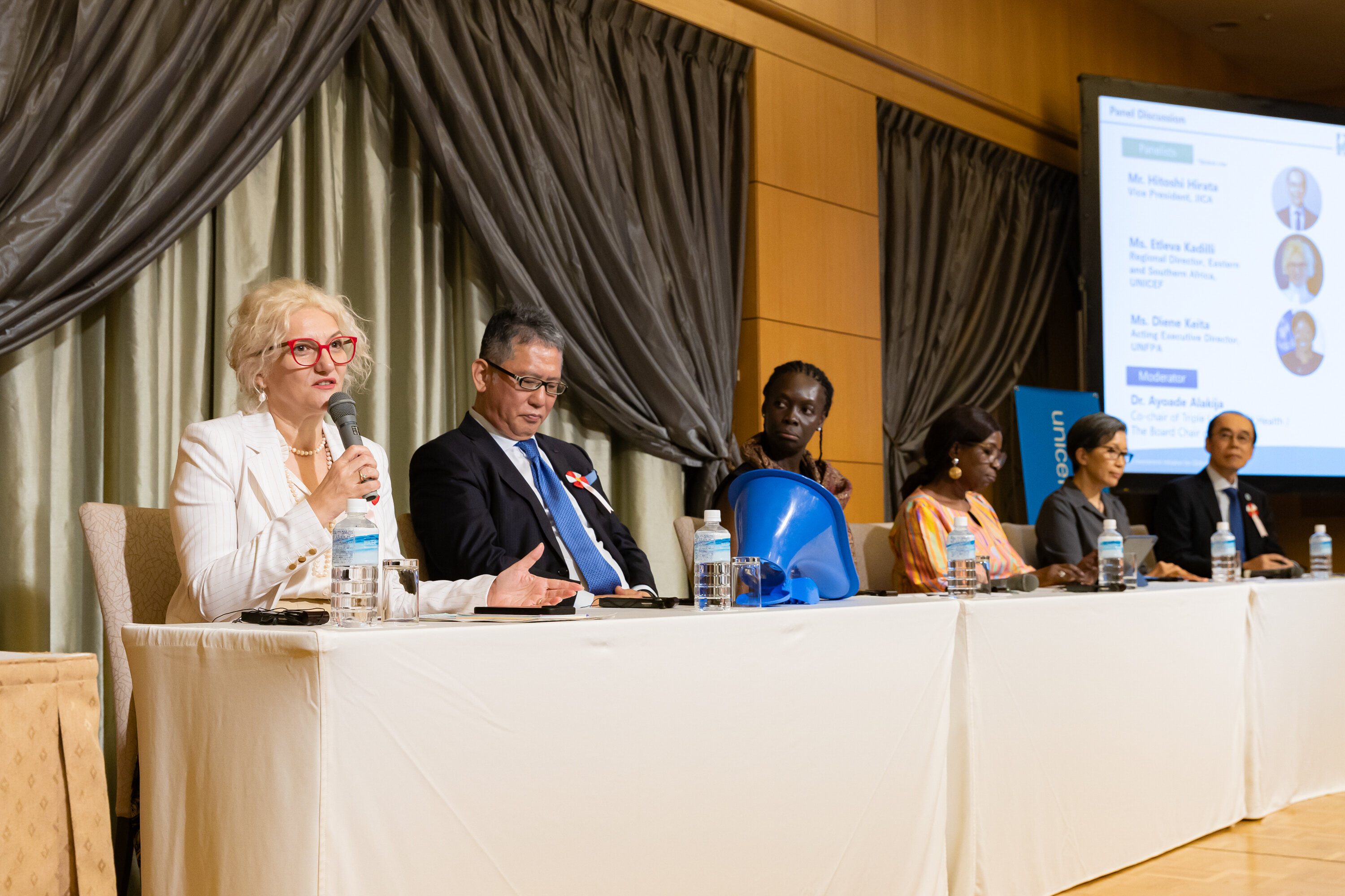 A panel discussion facilitated by Dr. Ayoade Alakija, Co-Chair of Triple I, brought together prominent leaders from JICA, UNICEF, UNFPA, LIXIL Corporation, mothers2mothers, and Mizuho Financial Group. Panelists shared best practices and strategies for catalyzing investments in Africa's healthcare sector.
